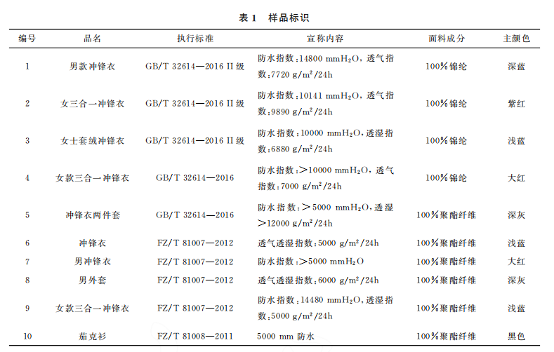 分別從實(shí)體店和網(wǎng)絡(luò)平臺(tái)購(gòu)買中端品牌的沖 鋒衣,不同品牌10件,價(jià)格區(qū)間在1000元左右。 其中 執(zhí) 行 標(biāo) 準(zhǔn) 標(biāo) 示 了 GB/T32614—2016 的 5 件,未標(biāo)示 GB/T32614—2016而宣稱有防水性 能和/或透濕性能的5件,詳見(jiàn)表1。