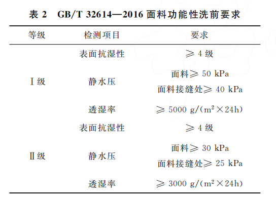 GB/T32614—2016《戶外運(yùn)動(dòng)服裝 沖鋒衣》 標(biāo)準(zhǔn)依據(jù)沖鋒衣的功能指標(biāo)對(duì)其進(jìn)行了級(jí)別劃 分。I級(jí)產(chǎn)品的防水透濕要求最為嚴(yán)格,適用于 專業(yè)戶外活動(dòng);II級(jí)產(chǎn)品相對(duì)I級(jí)產(chǎn)品的防水透 濕指標(biāo)稍低,可滿足日常的戶外休閑等活動(dòng)。對(duì) 于劃分I級(jí)、II級(jí)的功能性指標(biāo),應(yīng)在吊牌中標(biāo)注 “I級(jí)”或“II級(jí)”,不標(biāo)注的均視為I級(jí)產(chǎn)品。面料 功能性又分洗前和洗后要求,本文考慮了樣品成 本和比較目的達(dá)成兩方面的原因,只測(cè)試和比較 面料功能性洗前要求,見(jiàn)表2。