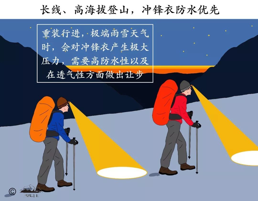 沖鋒衣的防水性與透氣性不可兼得,你在選購(gòu)時(shí),就不能指望買一件“全能型”沖鋒衣,而應(yīng)該根據(jù)自己的戶外活動(dòng)類型來(lái)平衡。