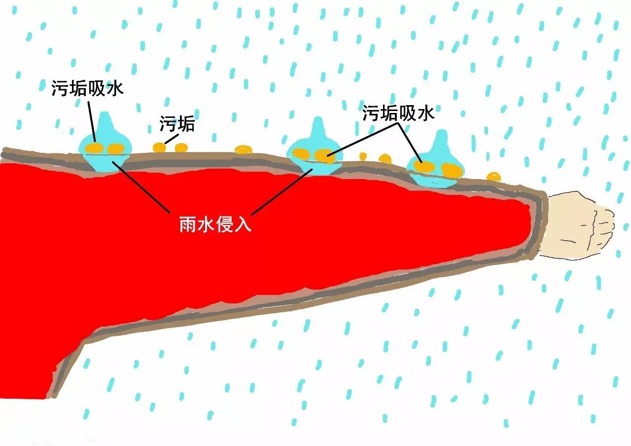 最初:涂層失效——污垢具有吸水的作用,衣服表面的污垢會給雨水可乘之機。