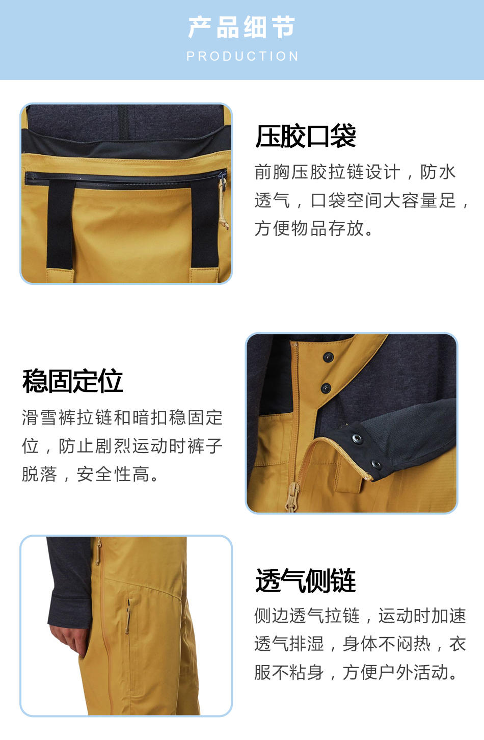 穩(wěn)固定位:滑雪褲加工的拉鏈和暗扣穩(wěn)固定位,防止劇烈運(yùn)動(dòng)時(shí)褲子脫落,安全性高。
