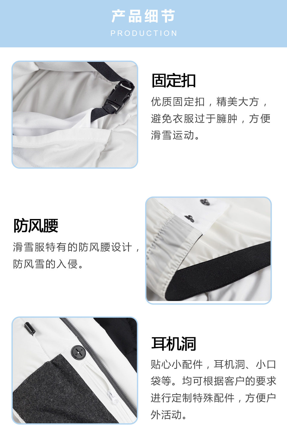 固定扣:優(yōu)質(zhì)固定扣,精美大方,避免衣服過于臃腫,方便滑雪運動。