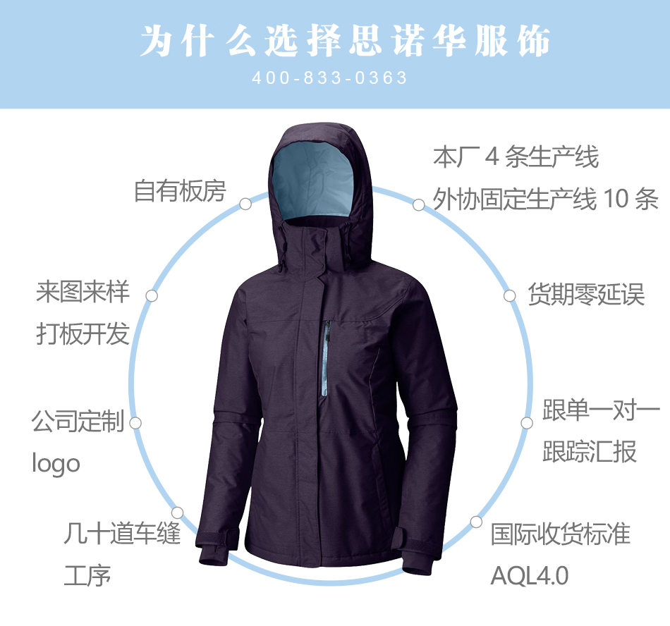 門襟處理:滑雪服生產的門襟進行拉鏈和暗扣處理,可根據客戶的要求特殊定制,方便戶外活動。